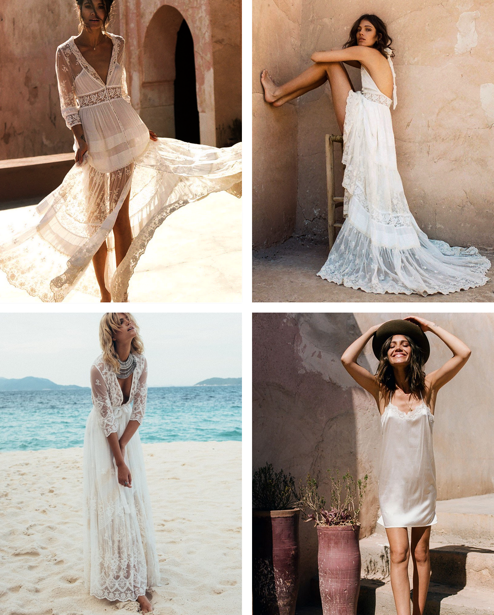 Les + d’une robe bohème chic : un dos nu entouré de dentelle et le plus important, le col en V. On préférera des manches en dentelle ou des bretelles « spaghetti ». Ensuite, on choisira plutôt une robe qui épouse la silhouette dans une matière très légère et fluide.
